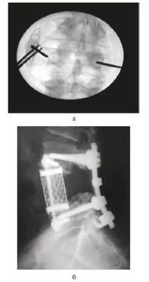 Через неделю после стабилизации состояния пациента был проведен второй этап операции — задняя транскутанная транспедикулярная стабилизация системой Viper (De Puy Spine) (рис. 5). Рисунок 5. Интраоперационное рентгеновское исследование. Момент установки транспедикулярных перкутанных винтов (а), боковая спондилограмма (б).