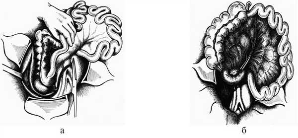После верхнесредне-срединной лапаротомии рассекаем париетальную брюшину на 1—2 см латеральнее слепой и восходящей ободочной кишок и параллельно им (рис. 6, а). Затем разрезом париетальной брюшины огибаем снизу слепую кишку и продолжаем его краниально и влево вдоль корня брыжейки тонкой кишки (см. рис. 6, б). Начиная со слепой кишки, отслаиваем ее и восходящую ободочную кишку с питающими их сосудами в медиальном и краниальном направлениях, а также брыжейку тонкой кишки (краниально). Последовательно отделяем всю нижнегоризонтальную и восходящую части ДПК, головку и тело поджелудочной железы, нисходящую и верхнегоризонтальную части ДПК от задней стенки живота (см. рис. 6, в). Перечисленные выше органы отводим также краниально. Затем отделяем переднюю стенку нисходящей части ДПК от корня брыжейки поперечной ободочной кишки (см. рис. 6, г).