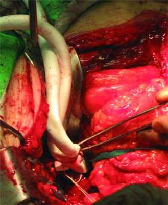 Операция производилась под наркозом в положении больного на спине совместной бригадой сосудистых хирургов и нейрохирургов. Осуществлен ретроперитонеальный доступ к передней поверхности позвоночника. При выделении аорты в области бифуркации обнаружена аневризма размером 5×6 см, распространяющаяся на правую подвздошную артерию. Задняя поверхность аневризмы интимно спаяна с телом LIV позвонка. Мобилизованы аорта проксимальнее аневризмы и подвздошные артерии дистальнее аневризмы. Наложены сосудистые зажимы на аорту и подвздошные артерии. Вскрыт аневризматический мешок и обнаружено, что задней стенкой аневризмы является разрушенное тело LIV позвонка. При этом выявлен продольный дефект дорсальной стенки аорты длиной до 2,5 см, тампонированный тромботическими массами, распространяющимися в область тела позвонка LIV. Принято решение провести пластику бифуркации аорты имплантом из политетрафторэтилена. Произведена резекция аневризмы брюшного отдела аорты и правой подвздошной артерии и выполнено бифуркационное аортоподвздошное протезирование аллопротезом (рис. 3). Рисунок 3. Этап операции — фиксация имплантата бифуркации аорты непрерывными швами.