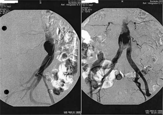 Физикальное обследование пациента не выявило признаков поражения аорты. В связи с подозрением на аневризму проведена аортография, подтвердившая предположение о формировании аневризмы аорты на уровне разрушенного позвонка LIV(рис. 2). Рисунок 2. Контрастная аортография -—прямая (слева) и боковая проекция. Определяется аневризматическое расширение аорты на уровне бифуркации. Экстравазального выхода контрастного вещества не отмечено.