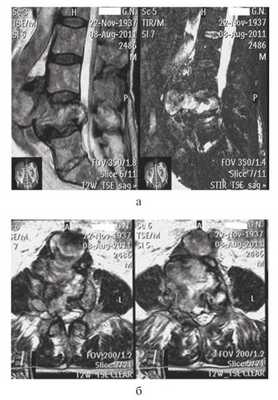 По причине развития болевого синдрома проводилось исследование показателей крови, биохимических индикаторов плазмы крови, воспалительных показателей. В связи с выявленным при МРТ поясничного отдела позвоночника разрушением тела LIII позвонка проведено исследование маркеров онкогенеза: ультразвуковое исследование внутренних органов, рентгенография легких, радиоизотопное сканирование костей скелета и другие элементы онкопоиска (рис. 1). Рисунок 1. МРТ поясничного отдела позвоночника (а — сагиттальная, б — аксиальная проекция). Отмечается разрушение тела LIV позвонка с компрессией дурального мешка больше справа. Костные структуры тела позвонка негомогенны. Опороспособность позвоночника нарушена. Прилежащая часть аорты аневризматически изменена. Дорсальная стенка аорты внедряется в полость разрушенного тела позвонка LIV. Выявлена умеренная хроническая анемия, без признаков хронического воспаления, специфического или онкологического (в том числе вторичного) поражения позвоночника.