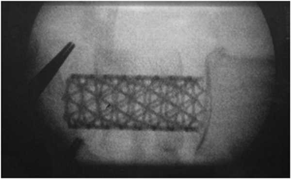 После имплантации протеза и восстановления кровотока начато удаление тела LIV позвонка. Аневризма формировала полость в теле позвонка, которая была заполнена сгустками крови и остатками фиброзной ткани межпозвонковых дисков. Частичное удаление костной массы позвонка не выявило в нем патологических изменений. При гистологическом исследовании удаленного материала — хроническая гематома. После полного удаления остатков кускованием тела позвонка осуществлен передний спондилодез с использованием сетчатого межтелового импланта. Полость имплантата наполнена бикальцифосфатным стимулятором направленного роста кости в виде чипсов Bonemedic (Intrarich) (рис. 4). Рисунок 4. Интраоперационное рентгеновское исследование. Положение импланта Mesh (Medtronic) в области удаленного тела LIV.