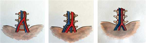 2. Рис. 2. Расположение бифуркации нижней полой вены (НПВ) по отношению к межпозвоночным дискам: а — высокая бифуркация, левая общая подвздошная вена (ЛОПВ) перекрывает преимущественно левую половину межпозвоночного диска LIV-LV и не перекрывает межпозвоночный диск LV-SI; b — средняя бифуркация, ЛОПВ перекрывает центральную часть межпозвоночных дисков LIV-LV и LV-SI; c — низкая бифуркация, НПВ перекрывает правую часть межпозвоночного диска LIV-LV, НПВ и ЛОПВ перекрывают полностью межпозвоночный диск LV-SI