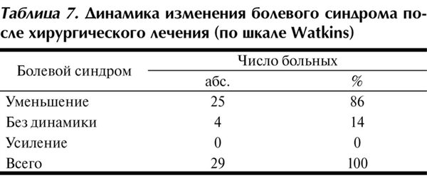 Таблица 7. Динамика изменения болевого синдрома после хирургического лечения (по шкале Watkins)