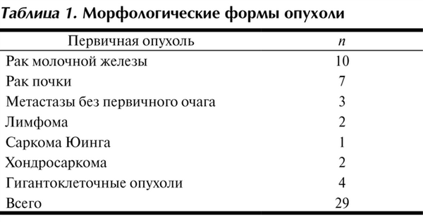 Наиболее часто встречалось метастатическое поражение при раке молочной железы — 10 (34%) больных, почки — 7 (24%) больных. Из первичных опухолей наиболее часто встречались гигантоклеточные опухоли — 4 (14%) больных.
