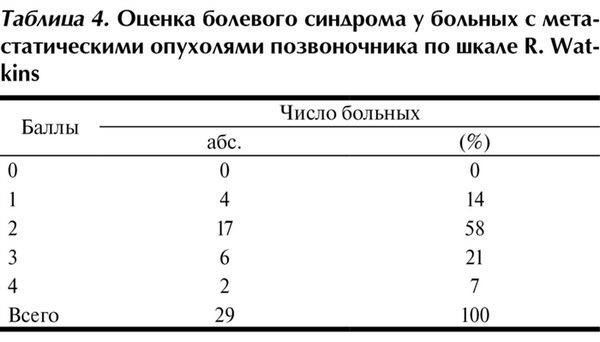 Таблица 4. Оценка болевого синдрома у больных с метастатическими опухолями позвоночника по шкале R. Watkins