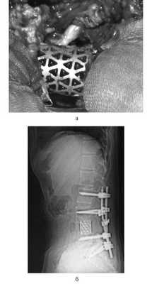 Рис. 1. Вертебрэктомия позвонка LIV с замещением дефекта сетчатым эндопротезом тела позвонка системой «MASH» и транспедикулярной фиксацией. а — интраоперационная фотография; б — послеоперационная рентгенограмма поясничного отдела позвоночника.