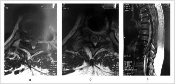 Рис. 1. Магнитно-резонансные томограммы грудного отдела позвоночника (Т1 режим): в аксиальной (а, б) и сагиттальной (в) плоскостях до операции.