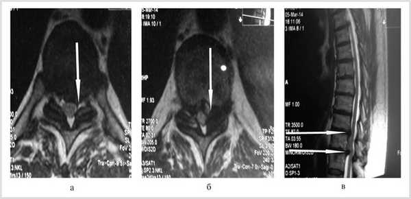 Рис. 1. Магнитно-резонансные томограммы грудного отдела позвоночника (Т1 режим): в аксиальной (а, б) и сагиттальной (в) плоскостях до операции.