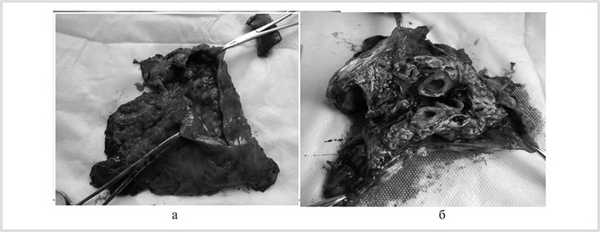 В удаленном препарате определялась тотальная эмпиема с толщиной стенки до 1 см (рис. 3, а), на разрезе легочная ткань была карнифицирована, с множественными кавернами, бронхоэктазами и очагами (см. рис. 3, б).