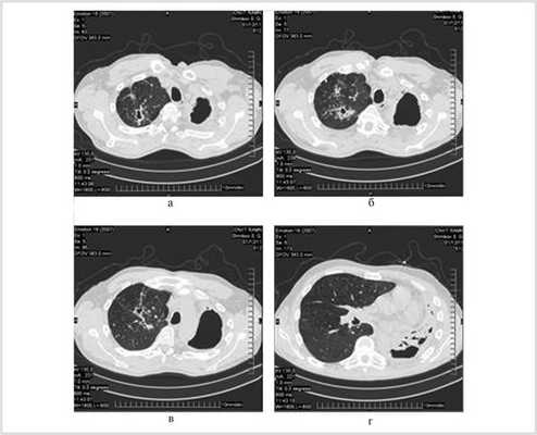 У всех больных по данным КТ на стороне наибольшего поражения установлено тотальное обсеменение легкого с множественными кавернами. Каверны диаметром 2—4 см в наиболее пораженном легком описаны у 24 (19,5%) пациентов, 5—6 см — у 57 (46,3%), 7 см и более — у 42 (34,1%).
