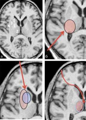 Рис. 2. Анатомо-топографическое обоснование используемых эндоскопических доступов c учетом анатомия базальных ядер. а — анатомия базальных ядер: 1 — внутренняя капсула (capsula interna); 2 —таламус (thalamus); 3 — чечевичное тело (nucleus lenticularis); 4 — наружная капсула (capsula externa); 5 — хвостатое ядро (nucleus caudatus). Анатомо-топографическое обоснование используемых эндоскопических доступов: б — при путаменально-таламических гематомах; в — при путаменальных и путаменально-капсулярных гематомах; г — при таламических гематомах с прорывом (для выполнения ЭТС и удаления крови из желудочковой системы). Стрелками указаны проекции эндоскопических доступов. Для точности установки портов использовалась система безрамной нейронавигации S7 «Medtronic». Таким образом, использовались три основных эндоскопических доступа: фронтальный, париетальный, прекоронарный (с одномоментным проведением ЭТС при ВЖК). При гематомах ЗЧЯ порт устанавливался в области от максимально короткой траектории до хирургической цели.