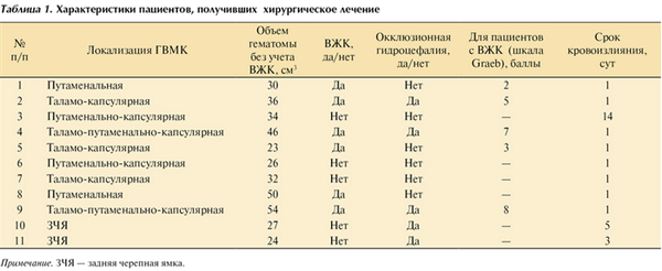 Представлены результаты хирургического лечения 11 пациентов с гипертензивными кровоизлияниями, в возрасте от 53 до 68 лет, оперированных с марта 2013 по декабрь 2014 г. Больные были госпитализированы или переведены в НИИ нейрохирургии из других неврологических стационаров; 8 (73%) пациентам оказана помощь в 1-е сутки от начала заболевания, 3 (27%) — на 3-и сутки и более.