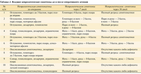 Таблица 2. Ведущие неврологические симптомы до и после оперативного лечения