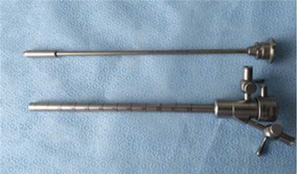 Всем пациентам проведены эндоскопические вмешательства с применением ригидной и гибкой оптики. Для эндоскопии нами использованы эндоскопы Karl Storz, системы GAAB и гибкий эндоскоп — «chip-on-tip». Диаметры рабочих портов, через которые осуществлялось хирургическое вмешательство, составляли 6 и 8 мм (рис. 1).