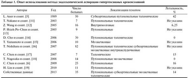 Результаты одного из первых исследований, посвященных удалению гипертензивных ВМГ, были опубликованы в 1989 г. L. Auer и соавт. [5]. Целью исследования было определение роли эндоскопического метода в лечении пациентов с ВМГ; для удаления гематом авторы применяли систему ультразвуковой дезинтеграции, встроенную в 6-миллиметровый эндоскоп. Использование многоканальных эндоскопов малого диаметра позволило выполнять вмешательства при глубинных кровоизлияниях без дополнительной травмы вещества мозга.