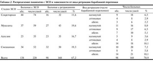 Распределение больных с ЭСО на различных стадиях течения в зависимости от вида ретракций барабанной перепонки представлено в табл. 2.