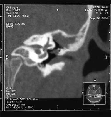 3) Врожденная холестеатома височной кости. Выявляется, как правило, при КТ височных костей, так как длительное время не проявляет себя клинической симптоматикой. Отсутствует в анамнезе острый средний отит, хорошо развита клеточная система сосцевидного отростка. Клинические проявления обусловлены ростом холестеатомы и деструкцией лабиринта.