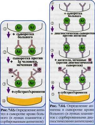 II. При определении антигена (правый рисунок) в лунки с сорбированными антителами вносят антиген (напр., сыворотку крови с искомым антигеном), добавляют диагностическую сыворотку против него и вторичные антитела (против диагностической сыворотки), меченные ферментом, а затем субстрат/хромоген для фермента.