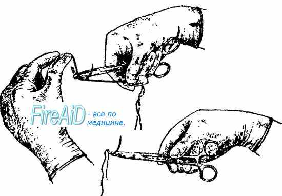Подача шовного материала осуществляется следующим образом. Нити без игл подают пинцетом, не касаясь их руками. Длина нити определяется видом шва.