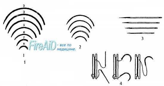Иглы имеют различную кривизну: более пологая — для кожи, со средней кривизной — для мышц, с самой большой кривизной — для глубоких слоев раны. Игла должна соответствовать толщине нити шовного материала.