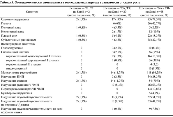 120 пациентам было проведено полное отоневрологическое обследование. Оценивали размер опухоли и сопутствующую симптоматику: нарушение слуха, вестибулярные симптомы в виде головокружения и спонтанного нистагма, мозжечковые расстройства (пальценосовая проба, нарушение статики), нарушение функции V, VII черепных нервов, бульбарные нарушения, нарушения вкусовой чувствительности (табл. 3). Таблица 3. Отоневрологическая симптоматика в дооперационном периоде в зависимости от стадии роста