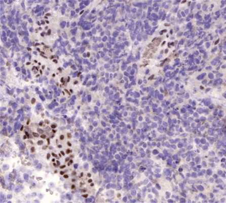 Рис. 5. Гистологический препарат опухоли. Иммуногистохимическое исследование, увеличение Х300. Отсутствие экспрессии INI1 в ядрах опухолевых клеток при сохранной экспрессии в эндотелии сосудов (внутренний контроль корректной работы антитела).