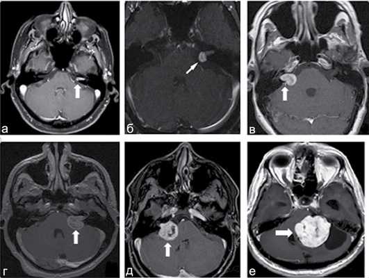 Классификация по Koos: I стадия: опухоль находится в пределах внутреннего слухового прохода, диаметр внутриканальной части составляет 1—10 мм; II стадия: опухоль вызывает расширение канала внутреннего слухового прохода и выходит в ММУ, ее диаметр составляет 11—20 мм; III стадия: опухоль распространяется до ствола головного мозга без его компрессии, диаметр составляет 21—30 мм; IV стадия: опухоль вызывает компрессию ствола головного мозга, ее диаметр более 30 мм. Ганноверская классификация по M. Samii: Т1 — интрамеатальная опухоль; Т2 — интра-экстрамеатальная опухоль; Т3а — опухоль заполняет мостомозжечковую цистерну; Т3b — опухоль распространяется до ствола головного мозга; Т4а — опухоль вызывает компрессию ствола; Т4b — опухоль грубо деформирует ствол мозга и IV желудочек (рис. 1) Рис. 1. МРТ головного мозга с контрастом. Примеры градации ВШ по Ганноверской классификации. a — Т1, интрамеатальная опухоль; б — Т2, интраэкстрамеатальная опухоль; в — Т3а, опухоль заполняет мостомозжечковую цистерну; г — Т3b, опухоль распространяется до ствола головного мозга; д — Т4а, опухоль вызывает компрессию ствола; е — Т4b, опухоль грубо деформирует ствол и IV желудочек. [7, 8].