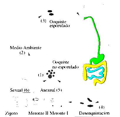 В результате размножения высвобождаются неспорулированные ооцисты, которые выводятся через фекалии и загрязняют окружающую среду, где он впоследствии созревает, до своей инфекционной эволюционной формы..