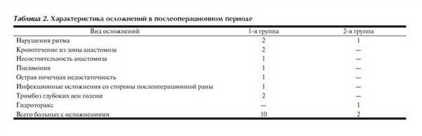 У 7 пациентов 1-й группы и у 3 пациентов 2-й группы в 1-е сутки после операции регистрировали признаки органной дисфункции по шкале SOFA. Число больных, у которых развились осложнения, было меньше во 2-й группе - 2 против 6 в 1-й группе. Общее количество осложнений в послеоперационном периоде в 1-й группе было больше, чем во 2-й, - 10 и 2 соответственно (табл. 2 ). Это и определяло длительность их пребывания в ОРИТ.