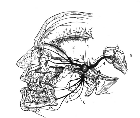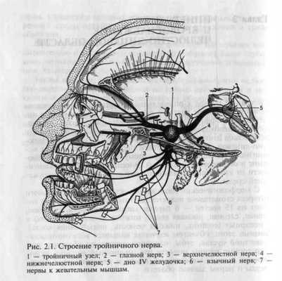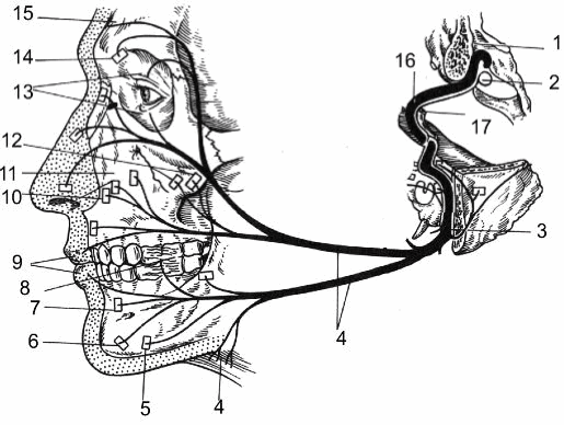 1 - тройничный узел; 2 - глазной нерв; 3 - верхнечелюстной нерв;