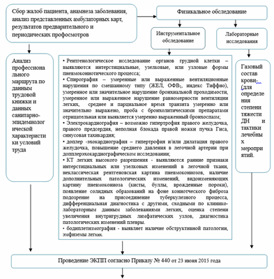 Жалобы и анамнез: В анамнезе присутствует указание на длительную профессиональную деятельность, связанную с воздействием пыли в концентрациях, превышающих ПДК. Учитываются данные о перенесенных ранее заболеваниях, что должно быть отражено в выписке из амбулаторной карты, в которой приводятся также данные о ПМО.