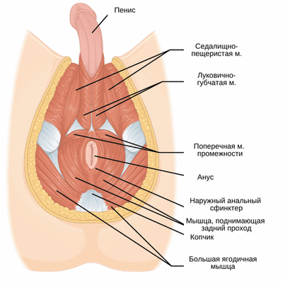 - Поверхностный слой: луковично-губчатая мышца промежности, седалищно-пещеристая мышца, поверхностная поперечная мышца промежности, наружный сфинктер ануса.