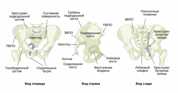 - Тазовые кости (каждая из которых образована подвздошной, седалищной и лобковой костями).
