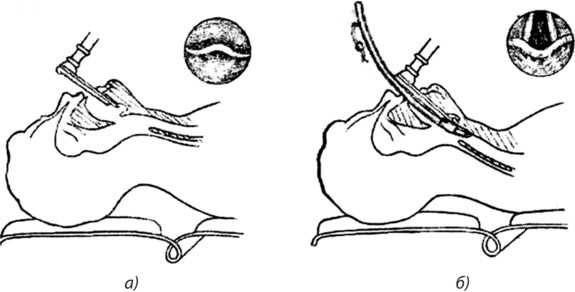 интубация трахеи: а — введение ларингоскопа в ротовую полость; б — смещение надгортанника кпереди и введение интубационной трубки через гортань и трахею