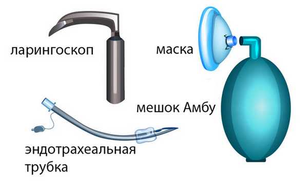 - Специальная маска на лицо, мешок Амбу для нагнетания воздуха, кислородный баллон, катетер для удаления содержимого дыхательных путей;