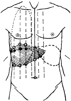 Рис. 429.Перкуторные границы печени по топографическим линиям. На тени печени точками обозначены границы абсолютной печеночной тупости, разница между относительной и абсолютной печеночной тупостью 1-2 см (одно или два ребра), что зависит от типа конституции.