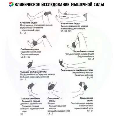 Сгибание бедра в тазобедренном суставе - тест, позволяющий определить силу подвздошной, большой и малой поясничных мышц. Просят сидящего больного согнуть бедро (привести его к животу) и одновременно, оказывая сопротивление этому движению, воздействуют на нижнюю треть бедра. Можно исследовать силу сгибания бедра и в положении пациента лёжа на спине. Для этого предлагают ему поднять выпрямленную ногу и удерживать её в таком положении, преодолевая давление вниз ладони врача, упирающейся в область середины бедра больного. Снижение силы этой мышцы относят к ранним симптомам поражения пирамидной системы. Разгибание ноги в коленном суставе - тест для определения силы четырёхглавой мышцы бедра. Исследование проводят в положении пациента лёжа на спине, нога согнута в тазобедренном и коленном суставах. Просят его разогнуть ногу, подняв голень. Одновременно подводят руку под колено пациента, придерживая его бедро в полусогнутом положении, другой рукой оказывают давление на голень по направлению книзу, препятствуя её разгибанию. Для тестирования силы этой мышцы пациента, сидящего на стуле, просят разогнуть ногу в коленном суставе. Одной рукой оказывают сопротивление этому движению, другой - пальпируют сокращающуюся мышцу.