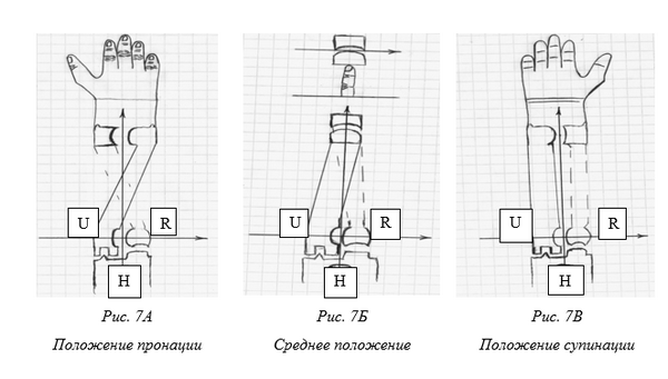 Следует учитывать, что рассматриваемые движения предплечья выполняются из среднего положения при согнутом до 90 º локтевом суставе (рис. 1), а ось вращения проходит через кисть, дистальный и проксимальный лучелоктевые суставы.