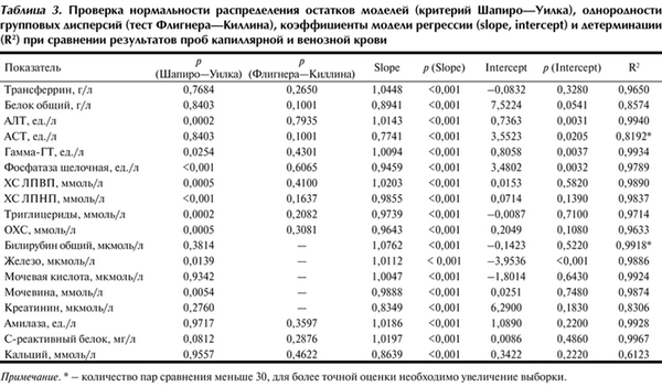 Результаты регрессионного анализа, проверки нормальности распределения остатков моделей и однородности групповых дисперсий представлены в табл. 3. Таблица 3. Проверка нормальности распределения остатков моделей (критерий Шапиро—Уилка), однородности групповых дисперсий (тест Флигнера—Киллина), коэффициенты модели регрессии (slope, intercept) и детерминации (R 2 ) при сравнении результатов проб капиллярной и венозной крови Примечание. * - количество пар сравнения меньше 30, для более точной оценки необходимо увеличение выборки. Следует отметить, что однофакторный дисперсионный анализ в определенной степени устойчив к нарушениям условий нормальности и гомоскедастичности [19]. В частности, при одинаковом числе наблюдений во всех группах метод устойчив к нарушениям условий однородности групповых дисперсий, а степень устойчивости дисперсионного анализа к определенным нарушениям условия нормальности прямо пропорциональна общему числу наблюдений.