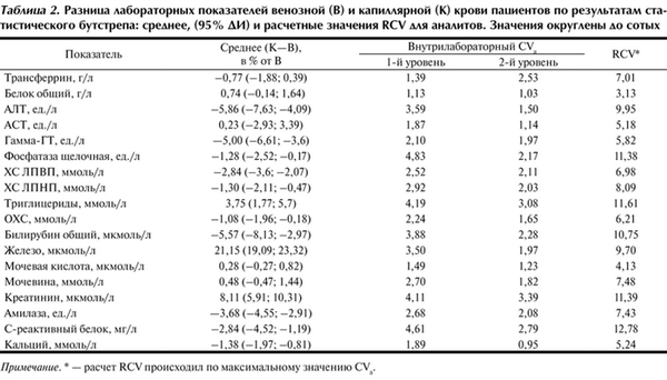 Для оценки вклада аналитической вариации в смещения показателей также сравнивали средние значения пар венозная-капиллярная кровь с расчетным значением RCV для конкретного параметра согласно формуле: RCV = 2 0,5 ·Z·(CVa 2 + CVi 2 ) 0,5 . Учитывая тот факт, что взятие биоматериала происходило условно единовременно, значение индивидуальной вариации (CVi) было приравнено нулю. Для расчета RCV использовалось долгосрочное значение CVa с числом контрольных измерений более 100.