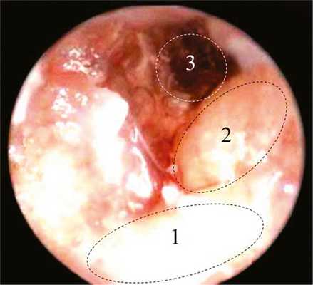 Рис. 5. Эндофотография (эндоскоп 45°) структур левого СУ (БП и цеп слуховых косточек удалены). 1 — тимпанальное устье слуховой трубы; 2 — канал мышцы, напрягающей БП; 3 — улитковыйотросток (processus cochleariformis) и сухожилие мышцы, напрягающей БП.