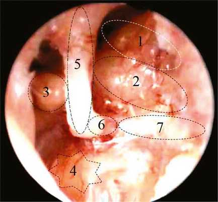 Рис. 3. Эндофотография (эндоскоп 45°) структур левого СУ (задний край annulustympanicus, барабанная струна и латеральная стенка аттика удалены). 1 — горизонтальный полукружный канал и область входа в антрум; 2 — тимпанальный сегмент ЛН; 3 — улитковыйотросток (processus cochleariformis) и сухожилие мышцы, напрягающей БП; 4 — промонториум; 5 — длинный отросток наковальни; 6 — стремя; 7 — сухожилие стременной мышцы.