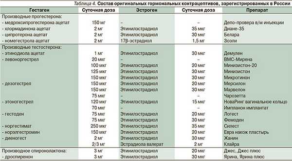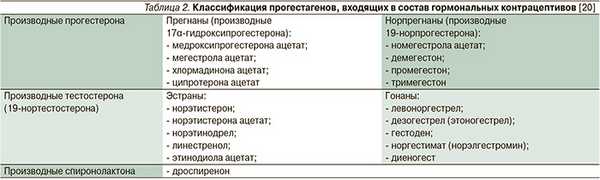 В отличие от почти постоянной эстрогенной составляющей прогестагенный компонент представлен в гормональных контрацептивах рядом синтетических производных прогестерона, тестостерона и спиронолактона (табл. 2) [20, 21].