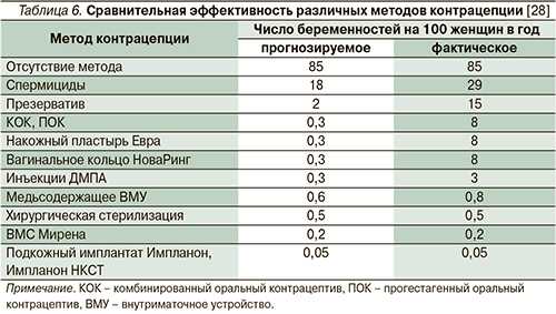 Для оценки эффективности методов предохранения от беременности используется индекс Перля, показывающий количество беременностей, наступивших у 100 женщин в течение года использования определенного вида контрацепции. Существует понятие эффективности метода при правильном использовании, отражающим, насколько он эффективен при точном соблюдении инструкции по применению, и фактическом, учитывающим непостоянное или неправильное использование (табл. 6). При правильном использовании методов ГК индекс Перля всегда составляет меньше 1, но при фактическом - он значительно отличается и доходит до 8 [9]. Причиной такого расхождения, по данным социологических исследований, служит нарушение режима использования метода (пропуск приема таблеток или очередной инъекции, нерегулярная замена вагинального кольца или пластыря) со стороны 70% женщин [32]. Наиболее эффективные методы, не зависящие от организованности пользователя: внутриматочная рилизинг-система с левоноргестрелом, устанавливаемая на 5 лет; и подкожные имплантаты с этоногестрелом, действующие в течение 3 лет. Индексы Перля при их прогнозируемом и фактическом использовании одинаковы и составляют 0,2 и 0,05 соответственно [28, 31, 33].