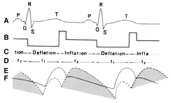 A — ЭКГ; B, C — сдувание баллона в систолу и его раздувание в диастолу; D — границы периодов активности баллона (в местах столкновений разнонаправленных стрелок); E — аортальное давление при ВАБК (штриховка), F — аортальное давление в норме (непрерывная линия)
