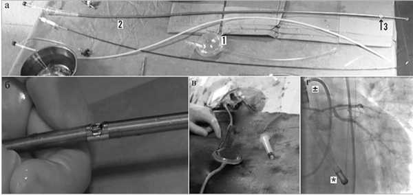 Устройство iVAC 2L состоит из внешнего мембранного насоса, катетера диаметром 17 Fr для реверсивного потока крови, запатентованного двухходового поворотного клапана (см. рисунок). Устройство PulseCath iVAC 2L. а — устройство PulseCath iVAC 2L: 1 — насос, 2 — катетер, 3 — клапан; б — двухходовой поворотный клапан, определяющий направление тока крови; в — насос, заполненный кровью; г — iVAC 2L in situ на рентгенограмме, дистальный кончик (*) располагается в полости ЛЖ, а двухходовой клапан (±) — над аортальным клапаном (с изменениями из [39]). Насос имеет две камеры: одну для крови, вторую для воздуха, разделенные гибкой мембраной. Кровяная камера соединяется с катетером, а воздушная камера подсоединяется к обычной консоли ВАБК. В 6 см от внутреннего кончика катетера имеется встроенный клапан, определяющий направление тока крови. Катетер заводится ретроградно через бедренную артерию так, чтобы его кончик находился в ЛЖ, а клапан — в восходящей аорте. Синхронизируясь с сердечным циклом, устройство в систолу забирает кровь из ЛЖ в камеру насоса, а в диастолу выбрасывает кровь из насоса в восходящую аорту.