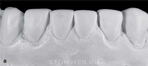 а -- модель препарированного зуба с десшеым краем: б -- границы удаления десшвого валика (закрашены, черным цветом): моделировка восковой модели пластмассовой тропки и ее отношение к открытой десневой бороздке
