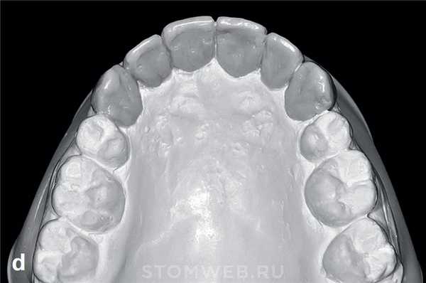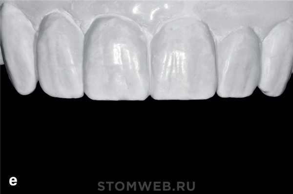 Рисунок 1 (е) Вестибулярный вид гипсовой модели, дублированной с ваксапа.