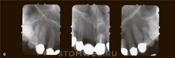 Рисунок 1 (с) Рентгенограмма до вмешательства, на которой видны результаты эндодонтического лечения и периапикальной хирургии в области верхнего левого центрального резца.